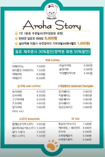 메뉴판을 보고 커피와 음료, 댕댕이 입장료 지불
